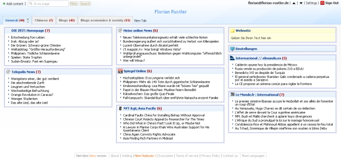 netvibes.com ist webbasiert, d.h. man kann die Anwendung, ähnlich wie seine yahoo-Emails, von jedem beliebigen Rechner aus aufrufen, solange dieser eine Internetverbindung hat. Die Daten werden alle zentral auf einem Server im Internet gespeichert. Mit netvibes lassen sich beliebig viele Feeds abonnieren und übersichtlich auf einer Seite darstellen (siehe Bild).