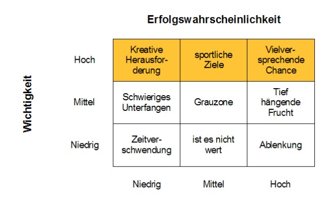 - Nun gleichen Sie jede der Herausforderungen, die Sie überlegen anzugehen, zuerst nach dem Kriterium Wichtigkeit und danach nach dem Kriterium Erfolgswahrscheinlichkeit ab. Als Bewertungsskala bietet sich ein System aus drei Einheiten (niedrig, mittel, hoch) an.