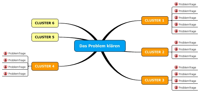 Bild 1 stellt eine Visualisierung der des Denkwerkzeugs Hervorheben dar, welches ich gestern vorgestellt habe. Die orangen Cluster symbolisieren die mit der unstrukturierten Technik Aussagenstarter gefundenen Problemcluster, die gelben könnten nachträglich hinzugefügt worden sein.