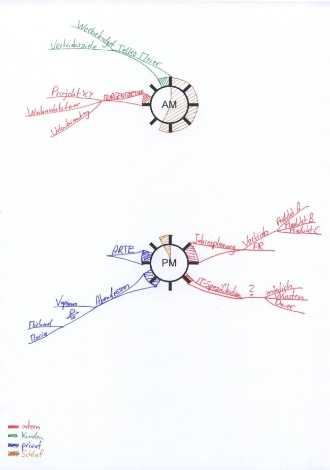 Der Vorteil besteht darin, dass man die verplanten Zeitstücke sieht. In Kombination mit Mind Mapping (Bild 3) könnte man nun die Ereignisse in Form von Zweigen an den Zeitkreis dranhängen und damit nicht nur das Ereignis an sich, sondern auch die Details in Form von Unterzweigen anschließen. Mit speziellen Farbcodes und Symbolen wie bei Mind Mapping könnte man noch mehr Infos hineinpacken. Angst, dass der Kreis überfüllt wird hätte ich nicht (zumindest nicht beim Großteil der Menschen), zumindest wenn in den Kalender nur Dinge hinein kommen, die an einen spezifischen Zeitpunkt gebunden sind (wie z.B. eine Besprechung) und der Kalender nicht als Todo-Liste mit verwendet wird.