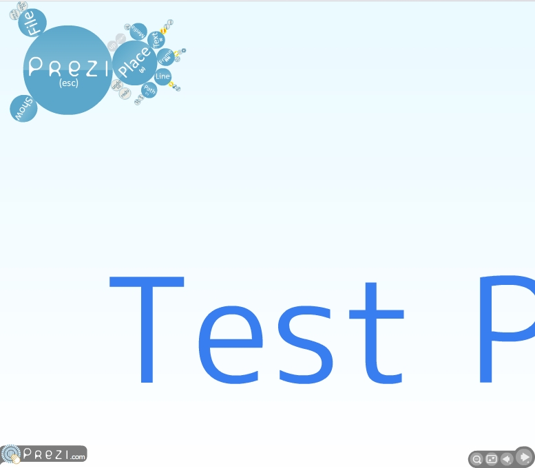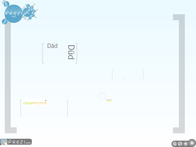 Prezi geht einen ganz anderen Weg, einen nicht-linearen Weg: Bei Prezi ist die gesamte Präsentation auf einer großen weißen Fläche angeordnet. Der Nutzer wird durch einen vom Ersteller der Präsentation vordefinierten Pfad durch Elemente auf der weißen Fläche geführt, wobei das jeweilige Element dann vergrößert dargestellt wird. Gleichzeitig ist es aber auch möglich den Vergrößerungsfaktor zu verändern und so weitere oder sogar alle Elemente auf der Leinwand zu sehen (siehe Bild 1). Mit einem Klick auf ein beliebiges Objekt wird dies fokussiert und vergrößert. Es entstehen Zooming-Presentations.