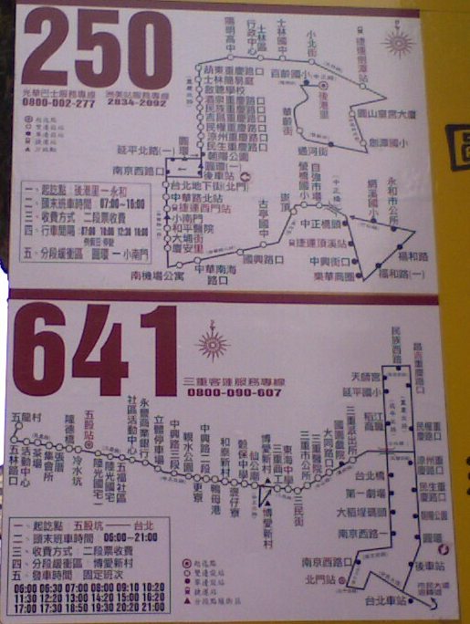 Das Bild zeigt zwei Busfahrpläne aus Taipeh. Die U-Bahnlinien sind auch schön auf Englisch beschrieben und man kommt als Ausländer gut zurecht. Die Busfahrpläne kann man hingegen nur mit Chinesisch-Kenntnissen lesen. Interessant ist hier, wie die Route des Busses angedeutet wird.