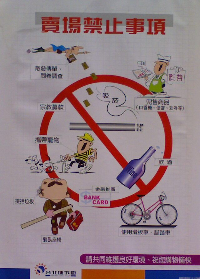 Im Moment bin ich wieder in Taiwan. Auch hier ist der Einsatz von Bildern zur Kommunikation besonders von Warnhinweisen und öffentlichen Aufklärungskampagnen besonders ausgeprägt. Comicartige Bilder finden sich allerdings fast überall, einfach nur weil es putzig aussieht. Auf meinem Weg durch Taipeh habe ich ein paar Schnappschüsse gemacht (leider in schlechter Qualität), um ein paar Visualisierungen zu zeigen.