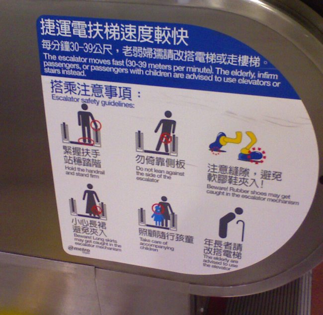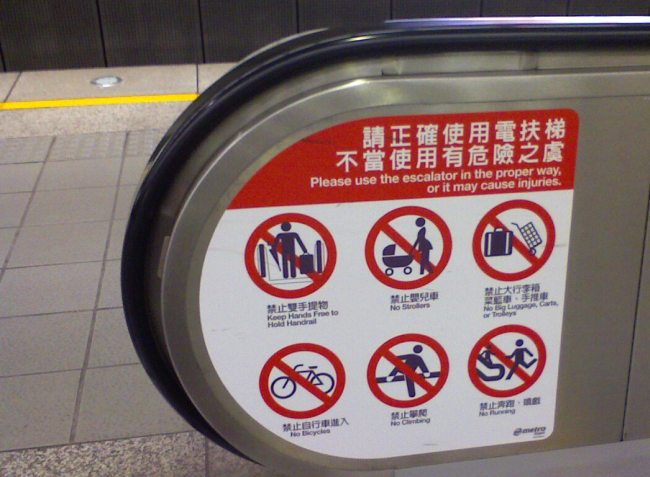 Hier in Taiwan wird man vielen Tipps und Hinweisen bedacht, wie man sich am besten beim Rolltreppenfahren verhalten sollte. Von Verboten bis zu Geboten ist alles dabei.