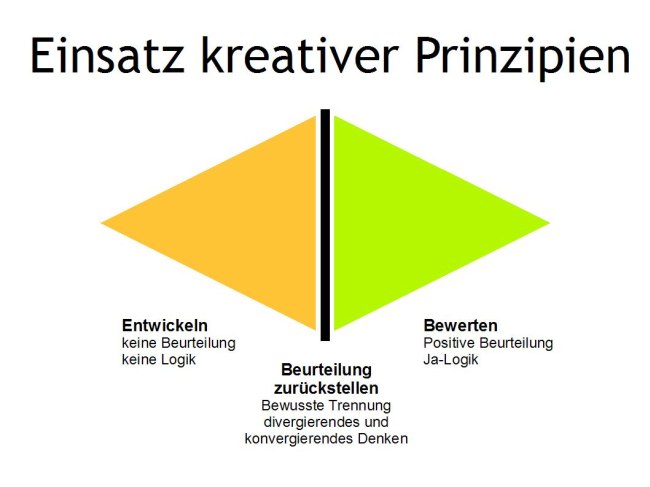 Anders gesagt, die Methodik alleine, ohne die anderen Faktoren hilft nichts, aber ein Workshop ohne die richtige Methodik kommt mit hoher Wahrscheinlichkeit auch nicht zum Erfolg.Ich arbeite in meinen Workshops mit dem Creative Problem Solving Verfahren, ein Orientierungsmodell, dass eine Gruppe auf sehr systematische Weise durch dein Einsatz von kreativen Prinzipien und Denkwerkzeugen und Kreativitätstechniken durch einen Problemlöseprozess führt. Denn um nichts anderes geht bei sämtlichen Workshops, egal ob diese nun Innovationsworkshop, Kreativworkshop, Ideenworkshop oder Strategieworkshop heißen.Zentral ist dabei die Trennung zwischen divergierendem und konvergierenden Denken, also die delikate Balance zwischen dem generieren von Optionen und der bewussten Auswahl und Filterung der Optionen. Für den Workshop heißt das, dass man dieses in die Breite schauen aushalten können muss. Besonders Ingenieuren fällt dies schwer, diese sind es gewohnt schnell zu einer Lösung zu kommen, was dazu führen kann, vorschnelle Schlussfolgerungen zu ziehen.