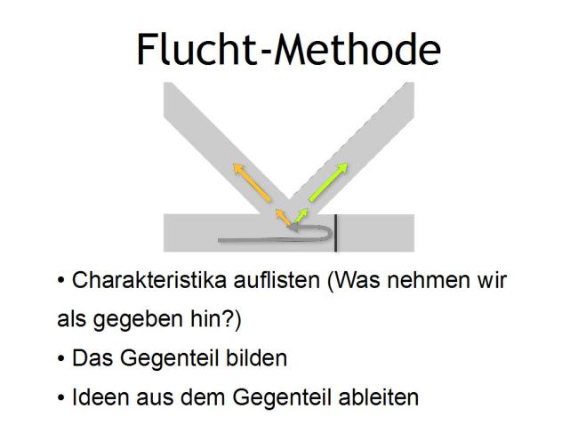 Ich habe kein Patentrezept und nicht der Weisheit letzten Schluss. Viel in der Lehre läuft deshalb so, weil man es „halt schon immer so gemacht hat“. Eine Möglichkeit aus den eingefahrenen Denkbahnen auszubrechen, die auch bei meinen Kreativtrainings und Innovationsworkshops oft zum Einsatz kommt, ist Edward de Bonos Fluchtmethode. Die Fluchtmethode ist eine Technik des lateralen Denkens, die einmal bewusst Grundannahmen hinterfragt, um daraus neue Ideen abzuleiten. (siehe Bild)