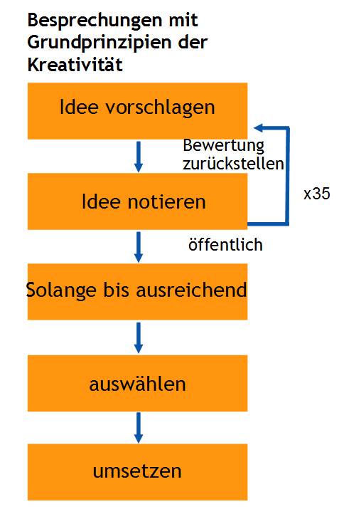 Das Besondere an dieser anderen Art Besprechungen durchzuführen ist, dass die Wahrscheinlichkeit deutlich erhöht wird neue und qualitativ hochwertige Optionen zu entwickeln, dadurch dass erst einmal viele Optionen entwickelt werden. Genauso wichtig ist, dass die Atmosphäre von einer Diskussion im „ja, aber…“-Stil hin zu einem „ja, und…“-Stil wechselt.