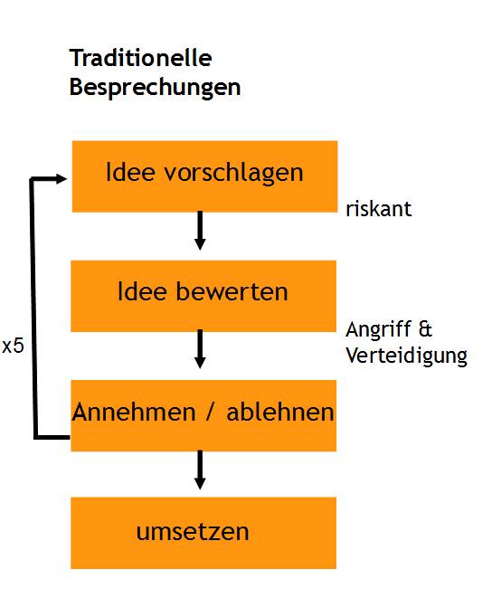 Von creaffective moderierte Innovationsworkshops sind im Prinzip eine lange über mehrere Tage dauernde Problemlöse-Besprechung. Wenn diese Workshop nach obigem Muster ablaufen würde, hätte ich wahrscheinlich keinen einzigen Kunden mehr. Nicht nur, dass diesen traditionellen Besprechungen nach diesem Muster sehr ermüdend sein können, die Wahrscheinlichkeit, dass neue Lösungen von hoher Qualität dabei herauskommen ist nicht sehr hoch. Das Ziel von einem Innovationsworkshop als auch vieler Problemlöse-Besprechungen ist jedoch genau das.