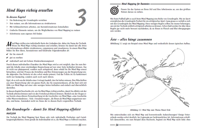 Die Abbildungen 1 und 2 zeigen wie das Buch layoutet sein wird. Beim Umbruch müssen nun noch ein paar wenige Details im Layout verändert werden und dann kann es in den Druck gehen. Die Inhalte stehen, auch alle Inhalte zur Buch DVD wie Videos und Grafikdateien sind fertig. Da das Buch in schwarz-weiß gedruckt sein wird gibt es alle Abbildungen im Buch noch einmal als farbige Grafikdateien auf der Buch-DVD. Auch einige der Filme des Mind Mapping Onlinekurses wird es in HD-Qualität auf der DVD geben.