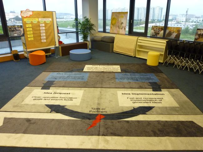 Bei manchen unserer Kunden gibt es spezielle Workshopräume, die flexibles und kreatives Arbeiten ermöglichen und mit ausreichend Materialien ausgestattet sind. Unser Kunde Bosch China hat in seinem neuen Headquarter in Shanghai ein phantastisches Innovationsforum eingerichtet in dem nun die von creaffective durchgeführten Führungskräftetrainings „Innovation Training for Leaders“ stattfinden.