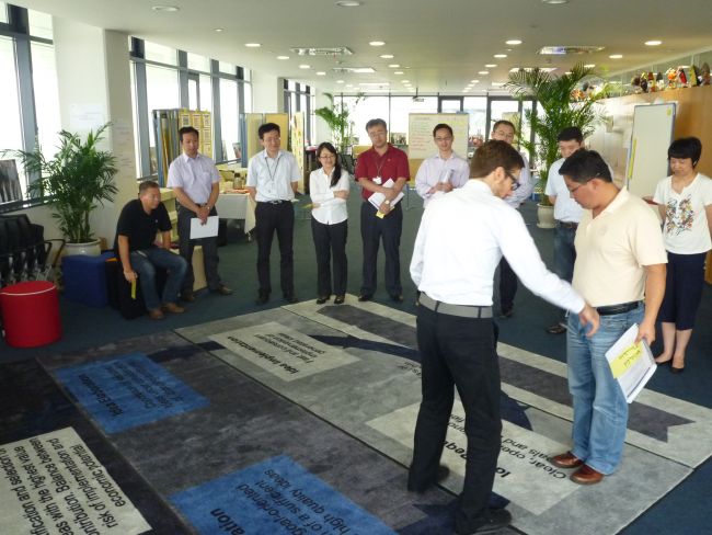 Ein Bestandteil des Trainings ist das Kennenlernen und Verstehen eines systematischen Prozesses der kreativen Problemlösung. Manche unserer Kunden entschließen sich, nach einem Kreativitätstraining ein Poster des kreativen Denkprozesses in ihren Besprechungsräumen aufzuhängen oder andere Arten von visuellen Ankern zu setzen. Seit kurzem gibt es bei Bosch den Prozessteppich, der diesen Innovationsprozess körperlich erfahrbar macht.
