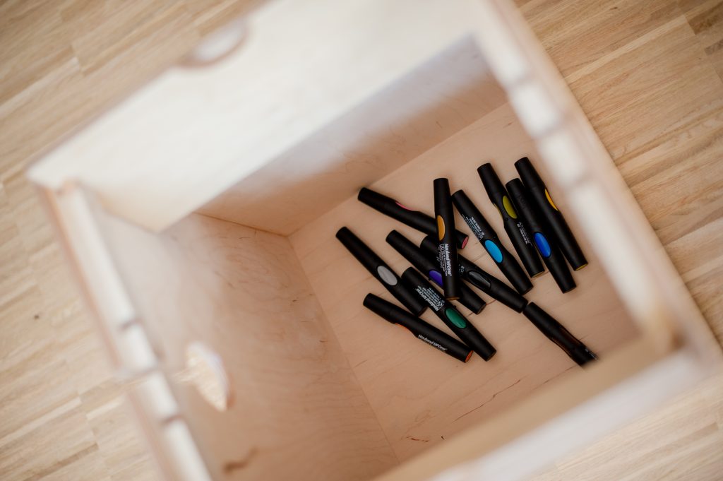 Wie es manchmal so läuft in diesen Projekten, entstand jedoch während der Ideenfindung eine Idee für ein Seminarmöbel, das wir als eine Mischung aus Kapa-Board-Halter und dem Musikinstrument Kajón beschrieben. Diese Idee war auch gar nicht für den asiatischen Markt gedacht. Zusammen mit unserem Haus und Hof Designer Kimi Gutierrez haben wir uns den Kopf zerbrochen, wie eine Alternative zu den normalen Workshop-Stellwänden aussehen könnte. Wir kamen auf die Idee eine Kombination aus Hocker, Materialaufbewahrung und Stellwand zu entwickeln, und Kimi desingte unser Baby in Punkto Ästhetik und Funktion. Wir fanden diese Idee charmant und ließen zu einem stolzen Preis fünf Prototypen bei einem Schreiner in der Nähe anfertigen. Seitdem standen die Kappajóns in unserem Seminar-& Workshopraum in München und sind bei uns im Rahmen unserer Workshops, Seminare und Ausbildungen mit Kunden im Einsatz.