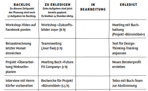 Alltägliche Aufgaben, die nicht direkt mit dem Projekt verknüpft sind, haben keinen Platz in der „To-Do-Spalte“ und sollten gesondert notiert werden. Auch sollten Projekte und Teams gerade für Einsteiger nicht zu groß sein.